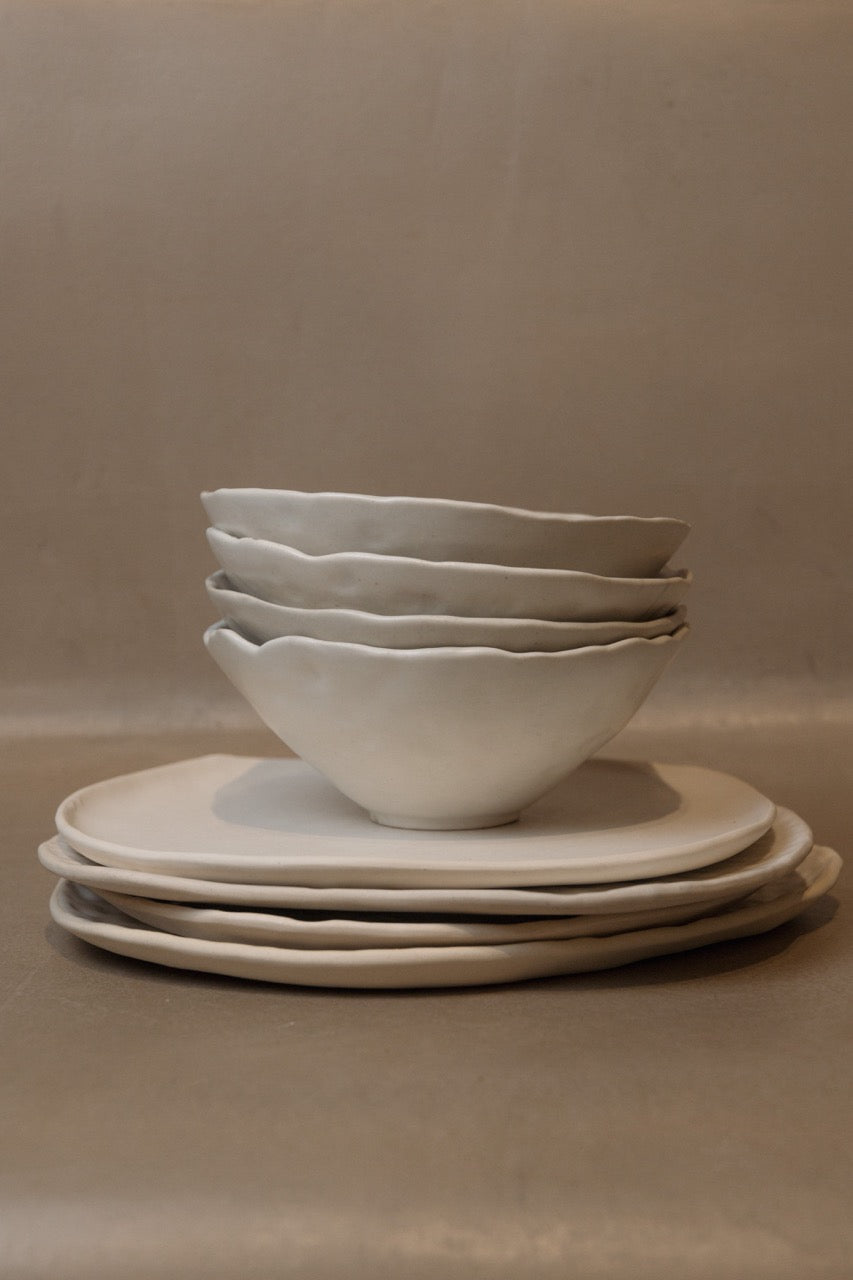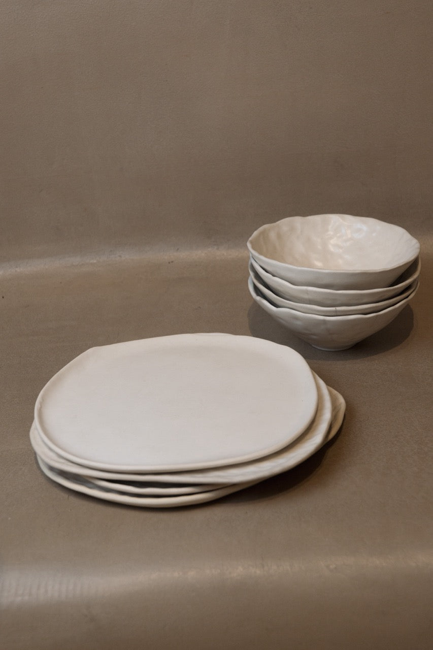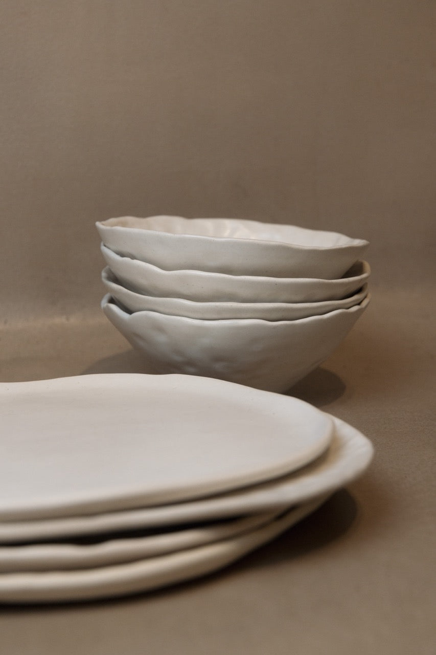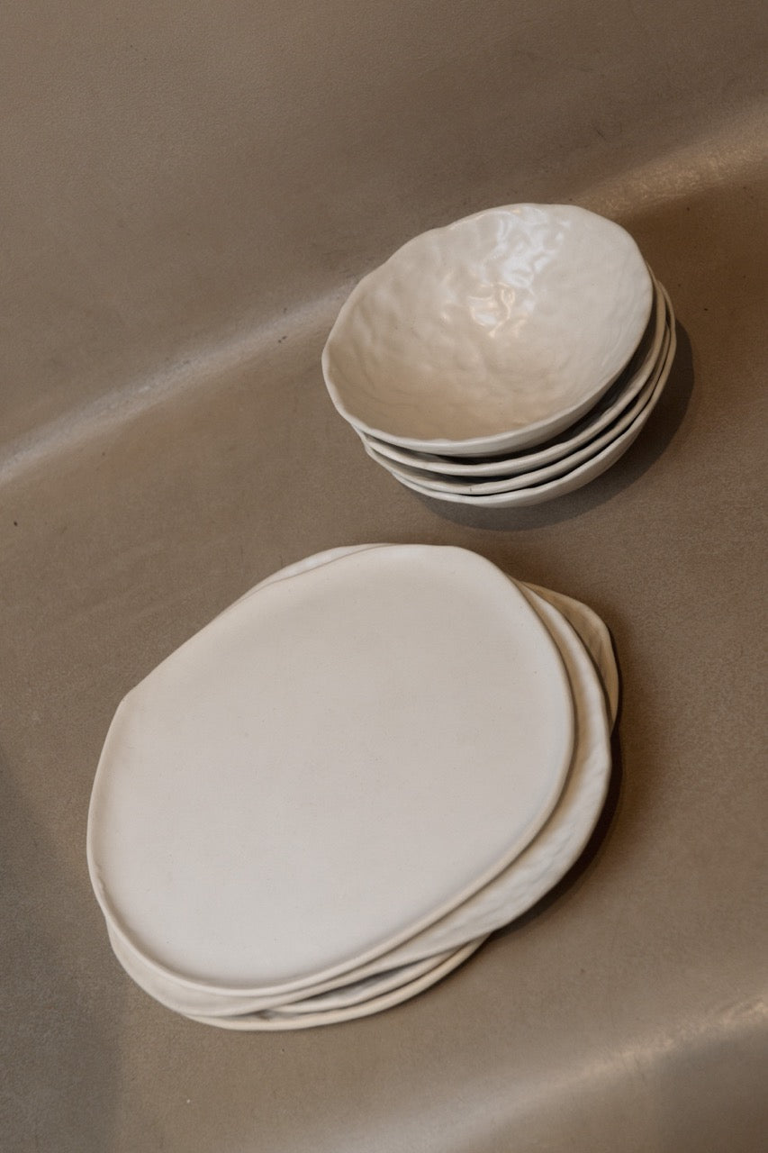 Bowls & Round plate. Shape of the Earth. Modled entirely by hand. Authentic to the natural forms, they are carved to hold your wholesome food. Share with friends and family. Lined up with our slow-paced production.